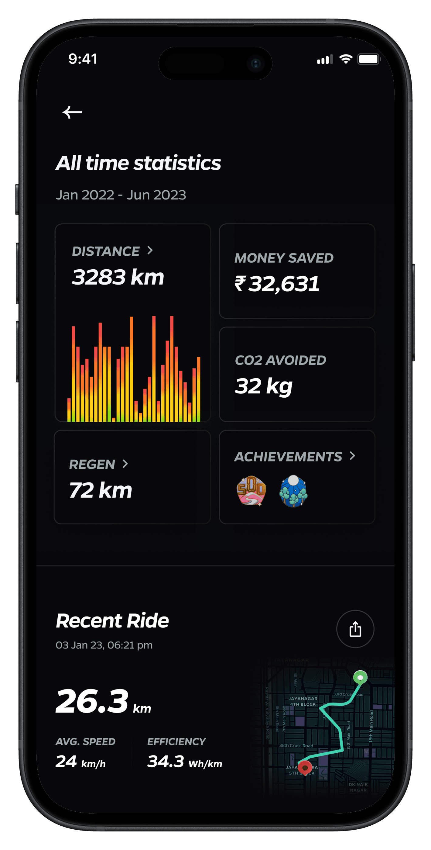We developed an in-depth ride analytics system that gamifies the process of feature discovery and usage while providing valuable insights to users. The solution included :