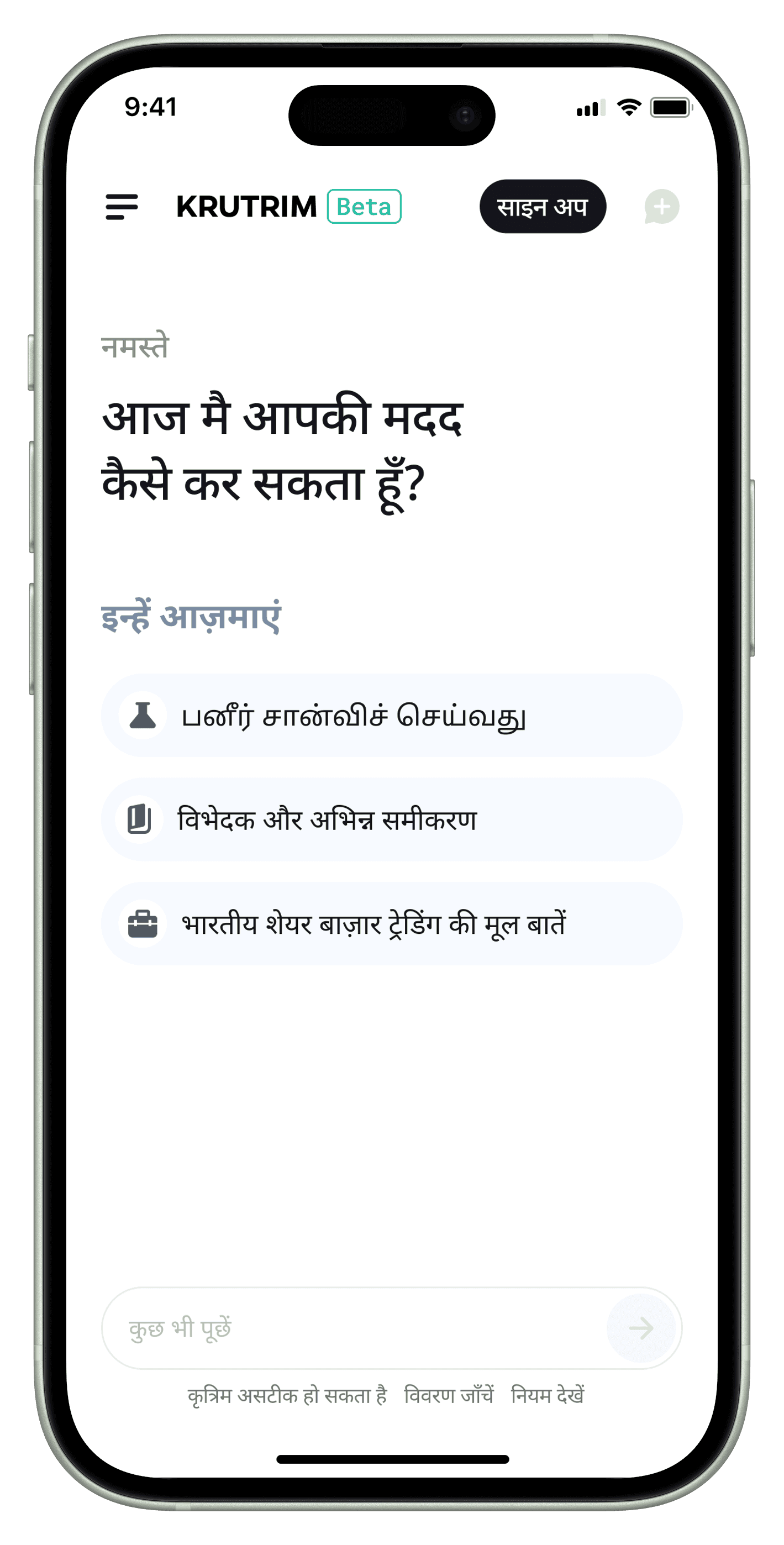 Krutrim AI's interface was meticulously crafted to address the unique challenges presented by India's linguistic and cultural diversity. The design philosophy centers around three core principles: simplicity, flexibility, and cultural sensitivity. These principles are woven into every aspect of the user interface, creating an app that is not just a tool, but a culturally resonant digital companion for users across India.