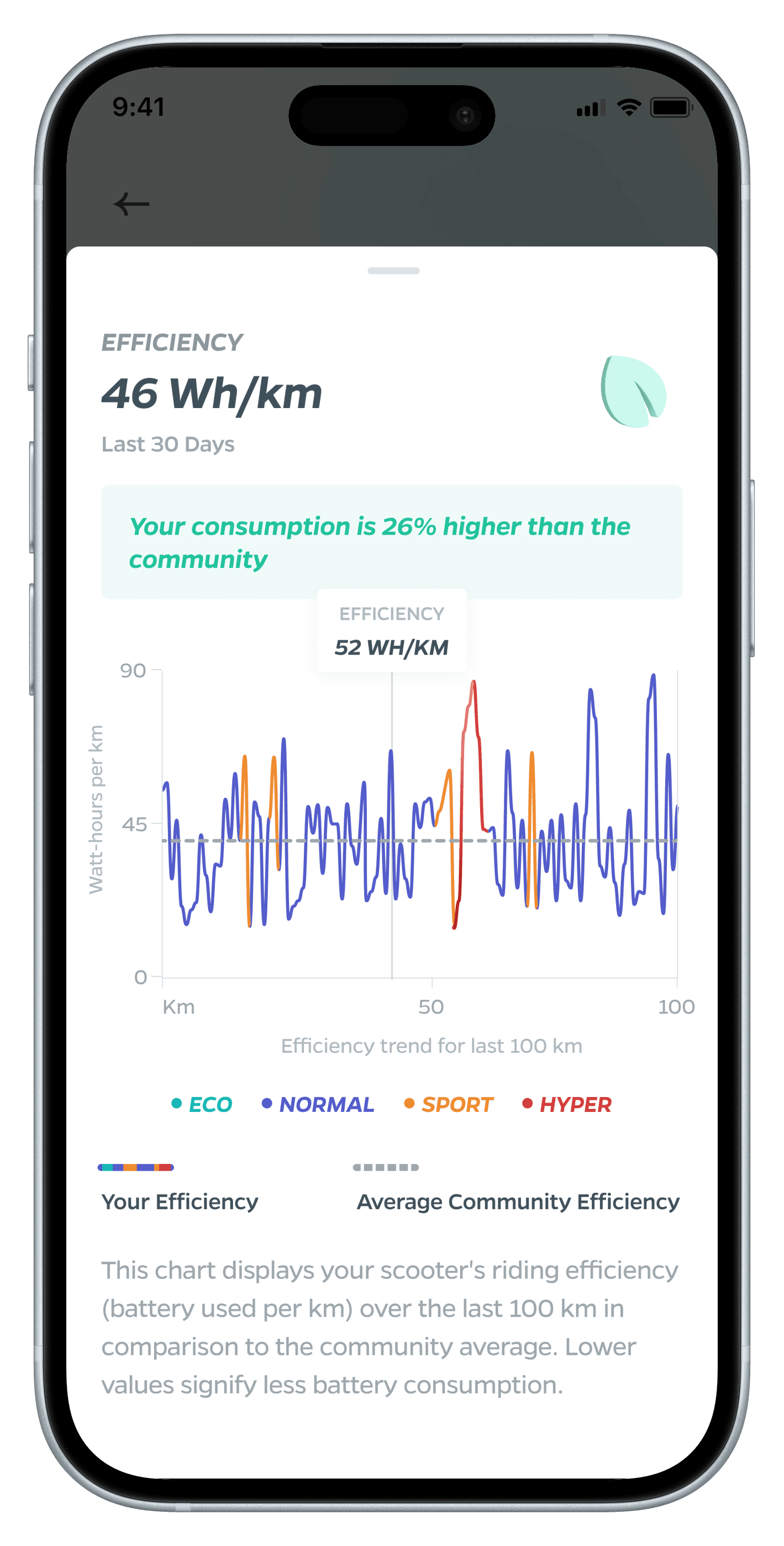 Detailed breakdown of energy mode usage (Eco, Normal, Sport, Hyper) with community comparisons